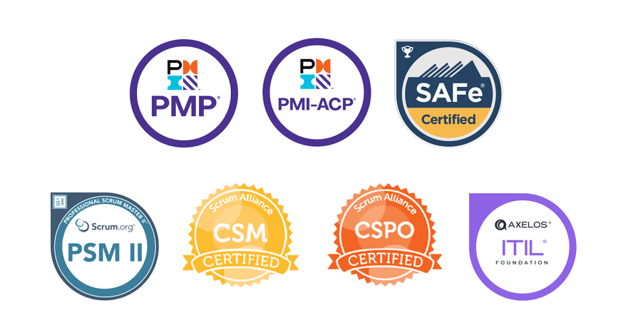 PMP, PMI-ACP, CSM, CSPO, PSM II, SAFe, ITIL