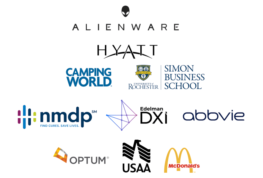 Past clients include AbbVie, Edelman DXI, McDonald’s, Dell Alienware, USAA, Camping World, Simon Business School, Optum, United Healthcare, and National Marrow Donor Program.